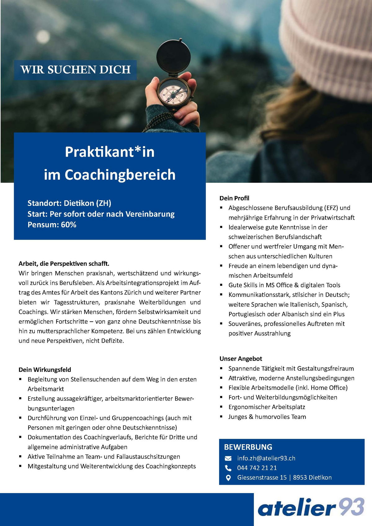 Verein Atelier 93Herr Luca ClementiTeamleiter Coaching / CoachGiessenstrasse 158953 Dietikon044 742 21 21